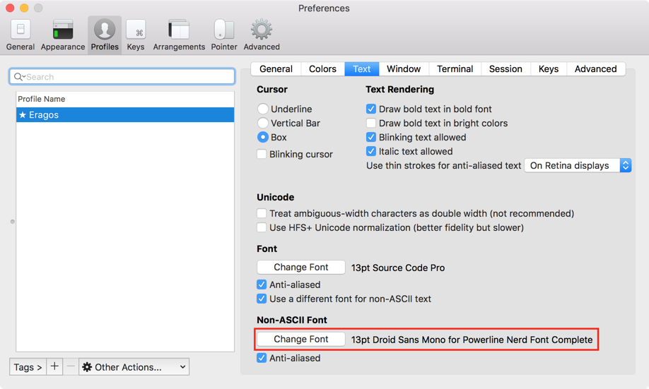 iTerm2 Setup non-ASCII Text Font Screenshot